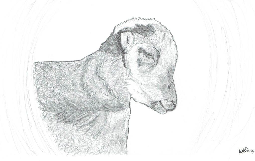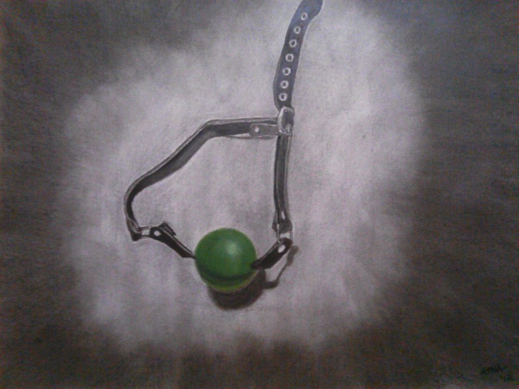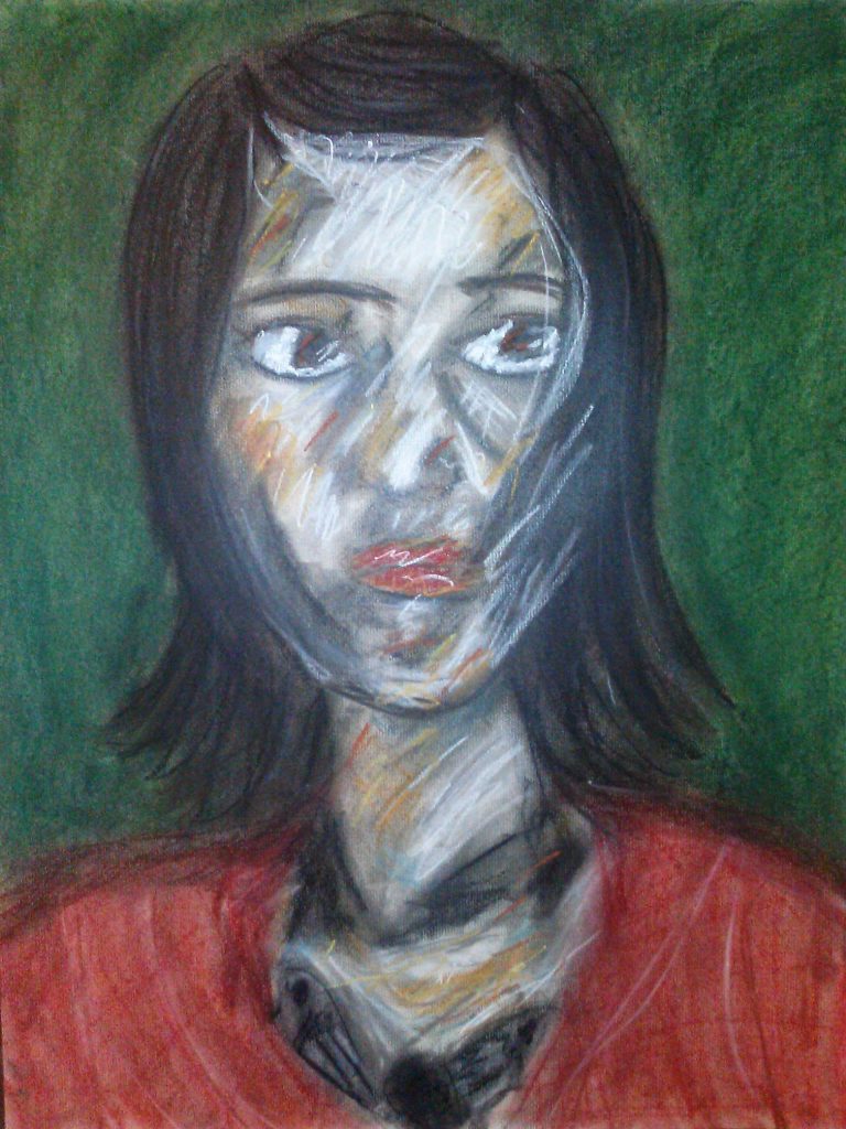 Chalk pastel drawing of a woman with pink hair and a yellow aura.